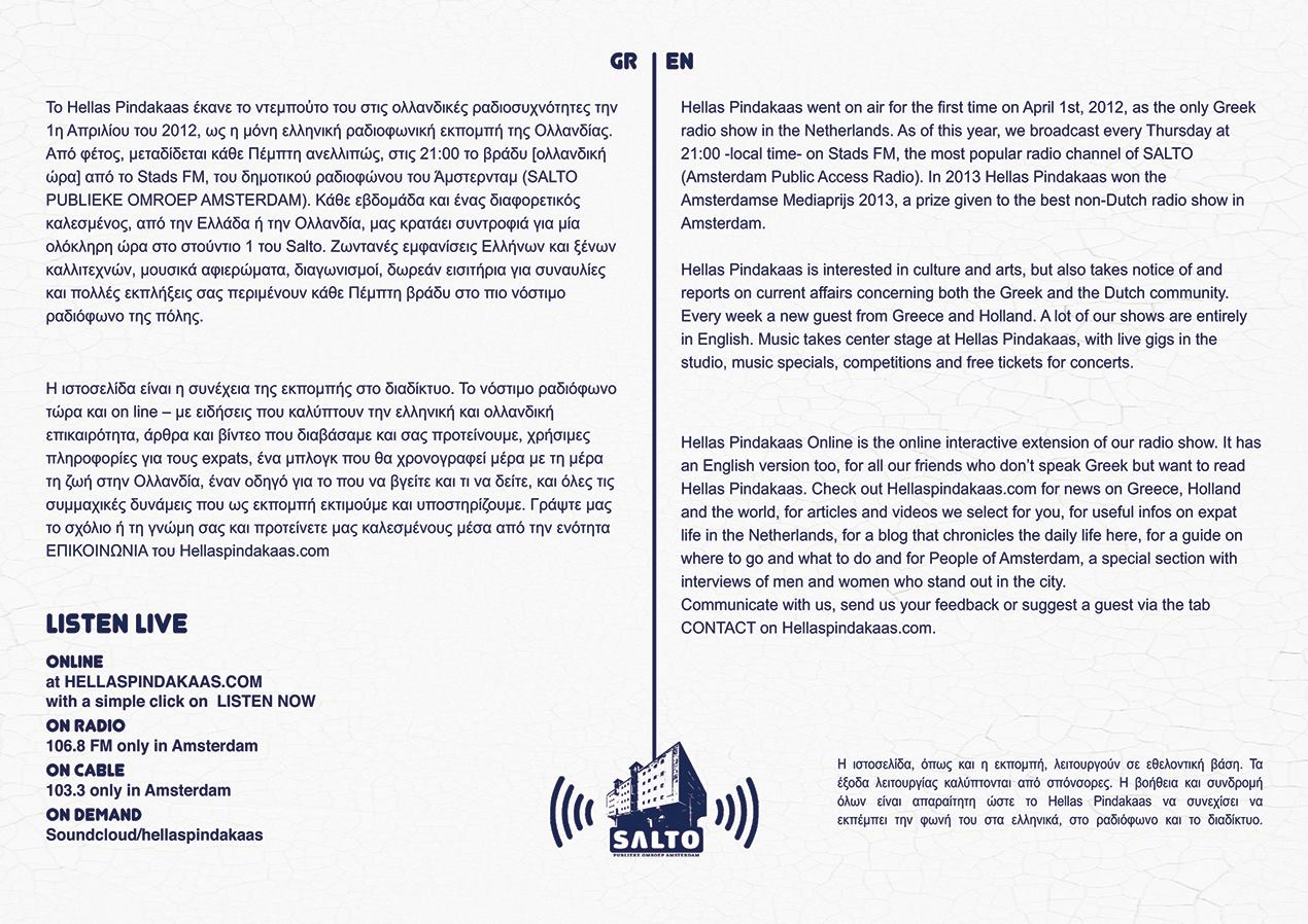 The show went on air for the first time on April 1st 2012, as the only Greek radio show in the Netherlands. Since then and up until now, Hellas Pindakaas has been broadcasting from Amsterdam every Friday at 21:00 -local time- on Salto/Wereld FM. Salto is the Amsterdam Public Access Television and Radio, and is powered by the Municipality of Amsterdam. Wereld fm is one of the five radio channels of Salto. It airs shows that are in languages other than Dutch. But something significant has changed lately…