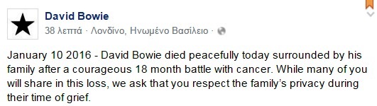 «Ο David Bowie πέθανε ήρεμα, έχοντας δίπλα του τα μέλη της οικογένειάς του, έπειτα από μια θαρραλέα μάχη 18 μηνών με τον καρκίνο. Πολλοί θρηνείτε μαζί μας την απώλεια, σας ζητούμε να σεβαστείτε την ιδιωτικότητα των στιγμών κατά τη διάρκεια του πένθους», έγραψε ο σκηνοθέτης και σεναριογράφος Duncan Jones, γιος του David Bowie και της Angela Barnett, στην σελίδα του ροκ σταρ στο Facebook.
