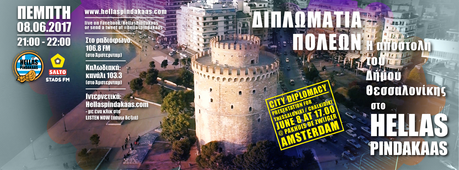 Στα πλαίσια της δράσης «Διπλωματία Πόλεων», η ομάδα του Δήμου Θεσσαλονίκης, με επικεφαλής τον Αντιδήμαρχο τουριστικής ανάπτυξης και διεθνών σχέσεων Σπύρο Πέγκα, μαζί με φορείς της πόλης και της Χαλκιδικής, βρέθηκαν στο Άμστερνταμ, στο κτίριο του Pakhuis de Zwijger, όπου παρουσίασαν την Θεσσαλονίκη και τη Χαλκιδική ως τουριστικούς, γαστρονομικούς, εκπαιδευτικούς, ιατρικούς και συνεδριακούς προορισμούς. Τέσσερα μέλη της αποστολής, ο Αντιδήμαρχος Σπύρος Πέγκας, ο Πρόεδρος του Thessaloniki Convention Bureau Γιάννης Ασλάνης, η Ειρήνη Σιδηροπούλου από την Aegean Airlines και ο Εφραίμ Κυριζίδης που εκπροσωπεί τη μείζονα αντιπολίτευση στο δημοτικό συμβούλιο της πόλης, βρέθηκαν μετά την παρουσίαση στο στούντιο του Hellas Pindakaas για να συζητήσουμε για τη δράση τους.